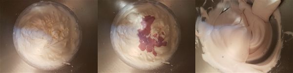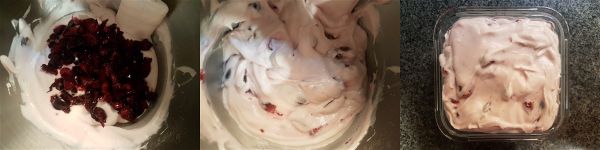 - Agregamos las cerezas, y mezclamos para que se repartan por todo el helado. Verás que se tiñe un poco todo el helado, sobre todo a medida que vayamos mezclando más. ¡No pasa nada! Queda bien bonito de ese color, y es todo natural 🙂