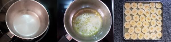 - Ponemos este almíbar en una bandejita o recipiente lo suficientemente grande como para que quepan los plátanos troceados y lo suficientemente pequeño como para que el almíbar los cubra. Yo tengo bandejitas para esto pero eran muy grandes, un tupper era muy pequeño, y al final lo he puesto todo en la tapa de una cajita metálica (hay que ingeniárselas de vez en cuando).